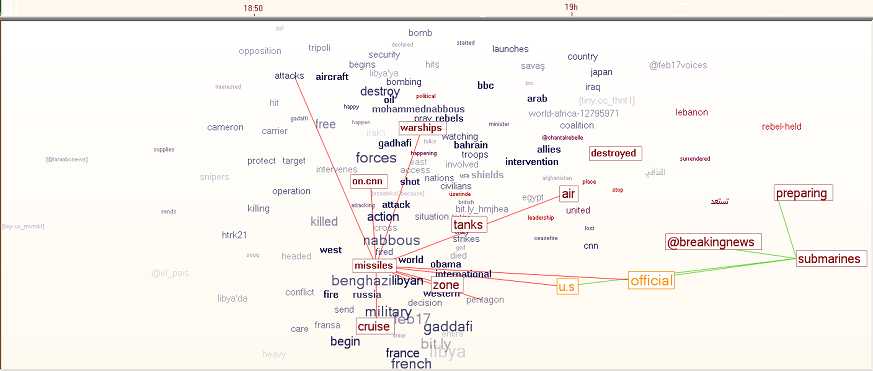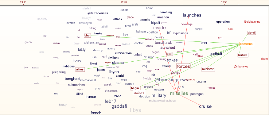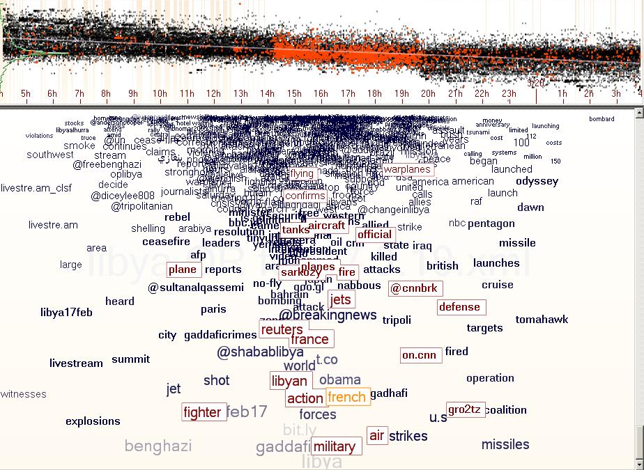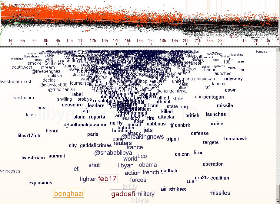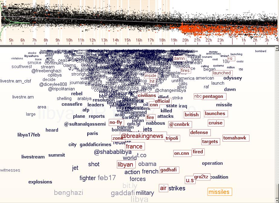 The following images show snapshots of the real-time tag cloud display at the begining of the NATO attack on Gaddafi's forces. Keywords from new messages appear in red on the right-hand side.