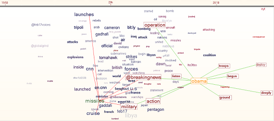 The following video shows a dynamic tag cloud that follows the twitter reporting arround the time of the initial attack on Libya. The representation of that attack is further discussed in the tag clouds that follow.